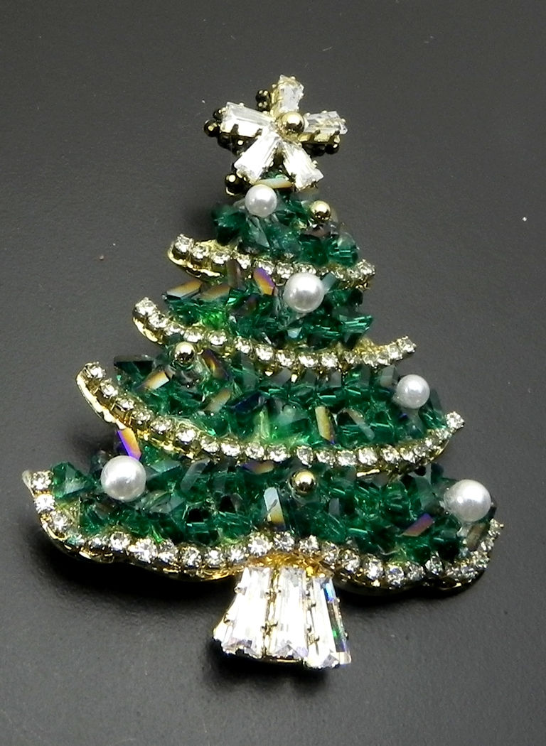 Christmas Tree Green Enamel & Pave Austrian Crystals Satement Brooch